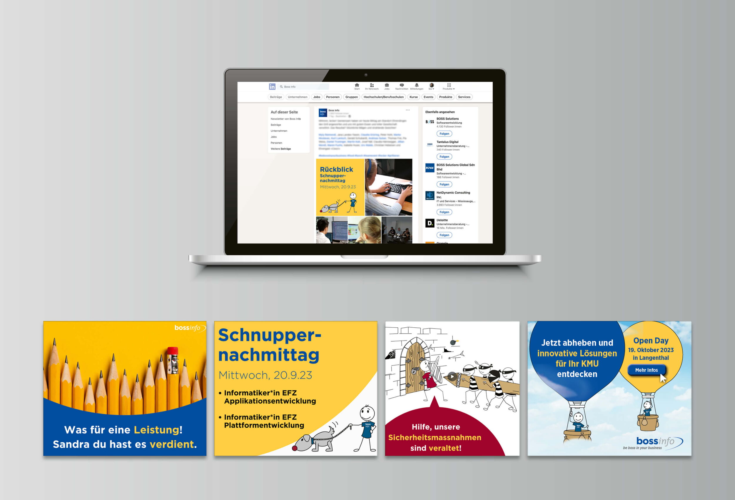 BIF steht für Boss Info Friends, Boss Info Family oder Boss Info Followers, die Strichmännchen für Boss Info. Die Entwicklung dieser Charaktere und die Erstellung einer Bibliothek (Frontify) waren nicht nur viel Arbeit, sondern bereiteten mir auch immense Freude. Insbesondere erfreute es mich zu sehen, wie sie sowohl von externen als auch internen Mitarbeitern genutzt wurden. Diese BIFs ermöglichten es, technische Themen auf eine verständlichere Weise zu erklären und auch weniger technikaffinen Personen diese Inhalte zugänglich zu machen. Ausserdem sorgen diese BIFs dafür, ein einheitliches Erscheinungsbild zu erzeugen.